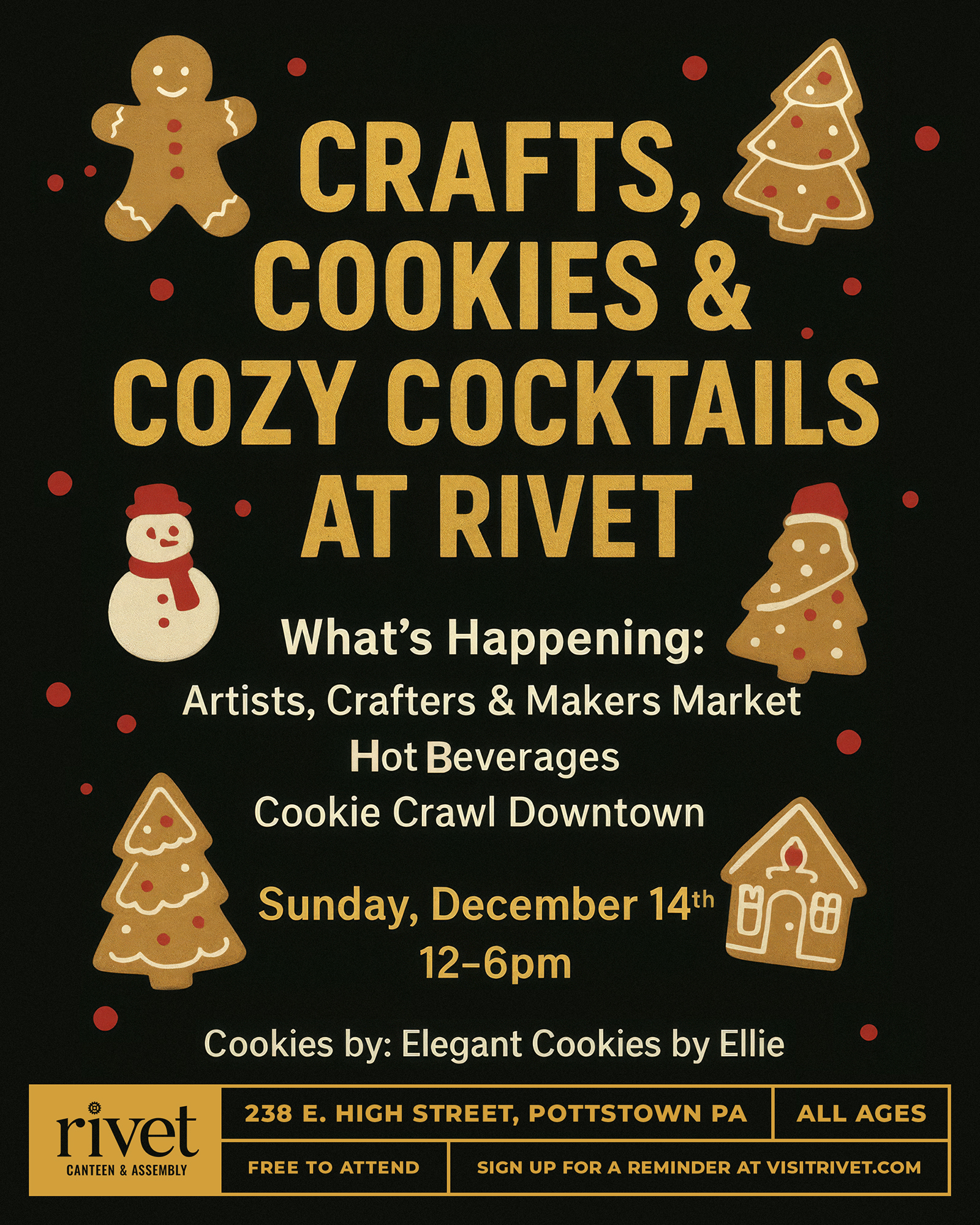 We can, however, now announce that Rivet will be participating with hot beverages, local vendors (crafts and artists), and delicious treats from Elegant Cookies by Ellie!