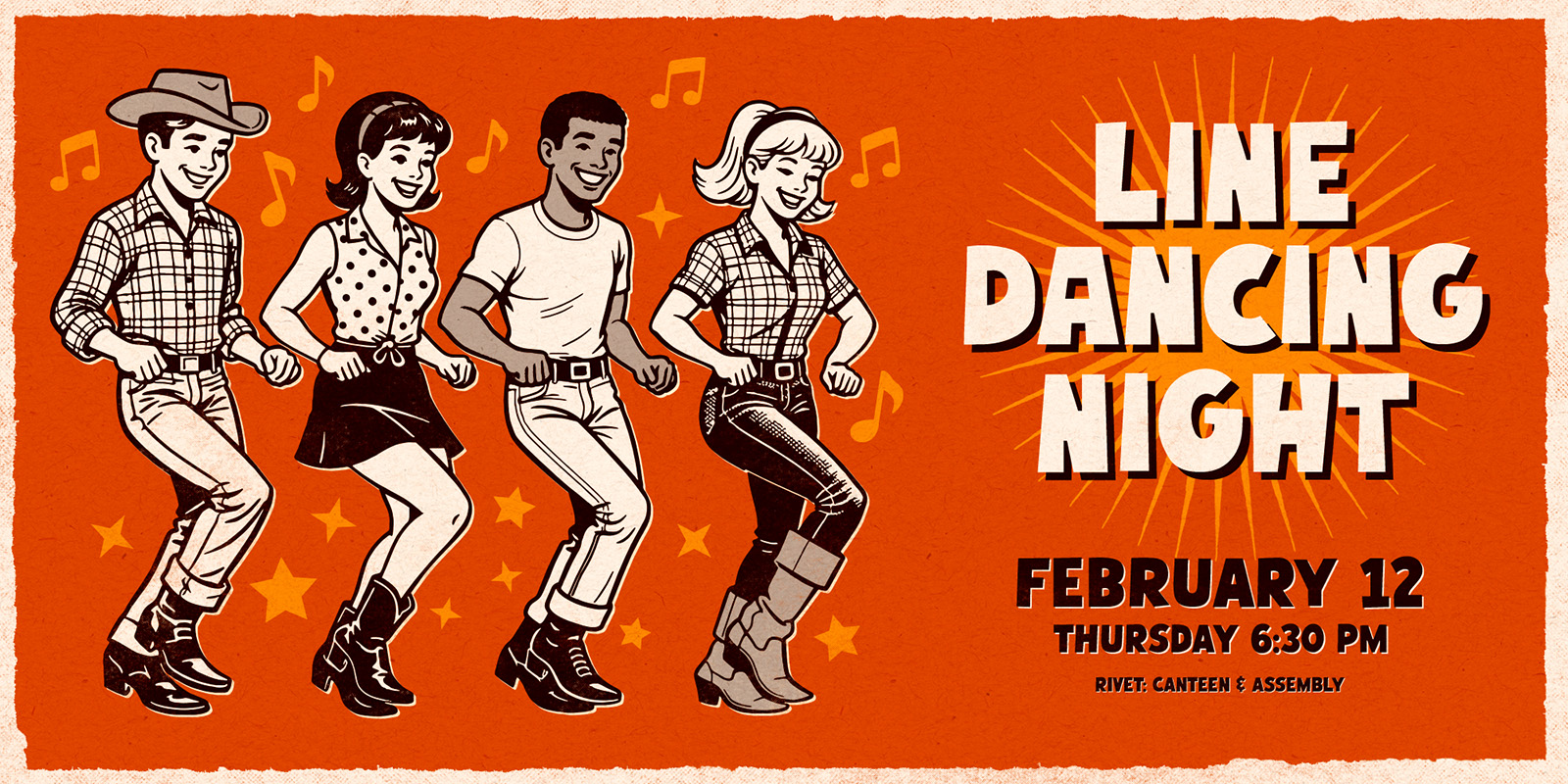 We are excited to host our very first line dancing night at Rivet on Thursday, February 12th! Whether you are brand new to dancing or already familiar, everyone is invited.