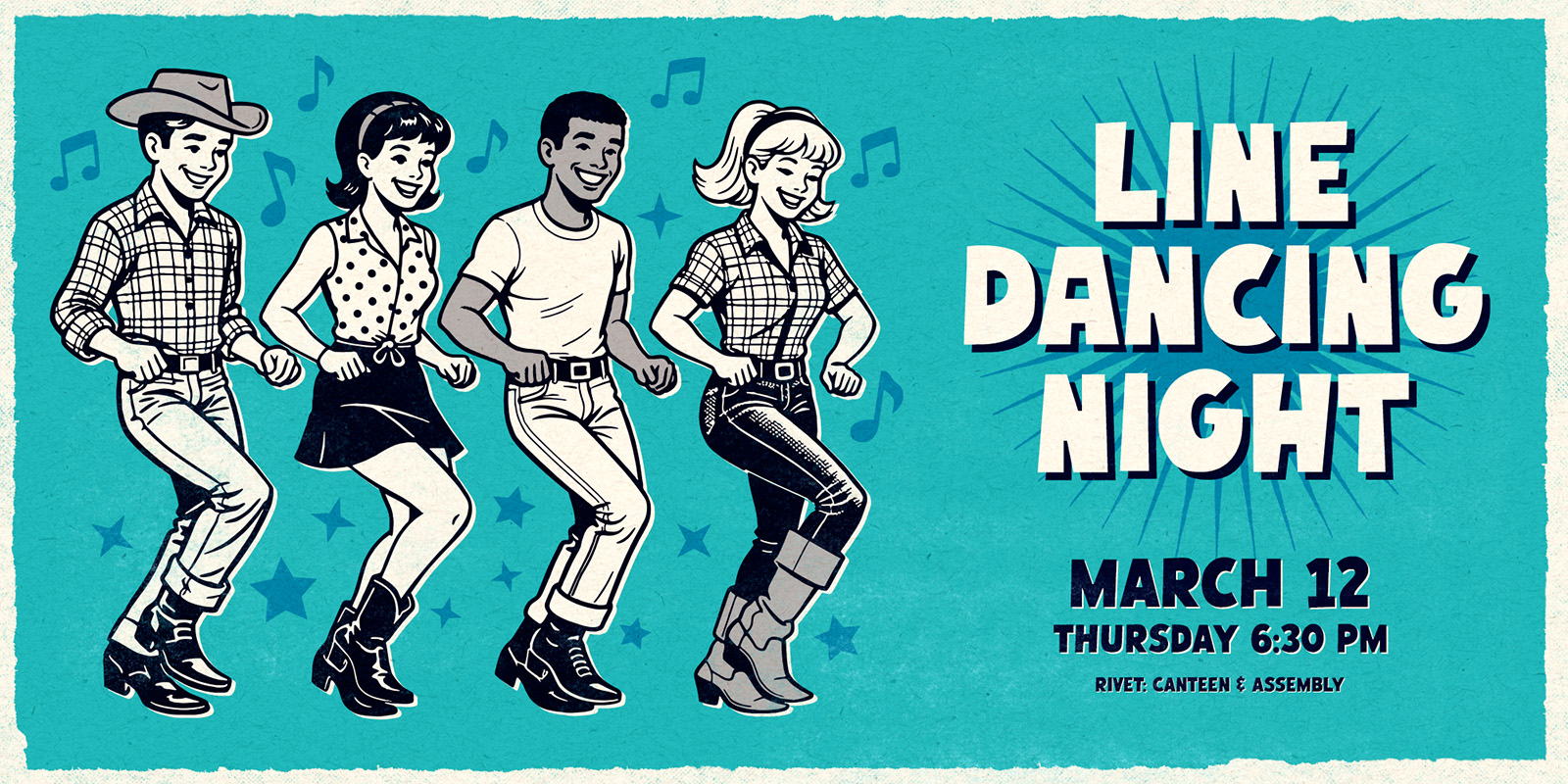 We’re excited to bring back Line Dancing Night after such a great turnout at our last one! So many of you showed up ready to learn and dance that we knew we had to do it again. Join us at Rivet on Thursday, March 12th for another fun-filled evening. Whether you are brand new to dancing or already familiar with the steps, everyone is invited!