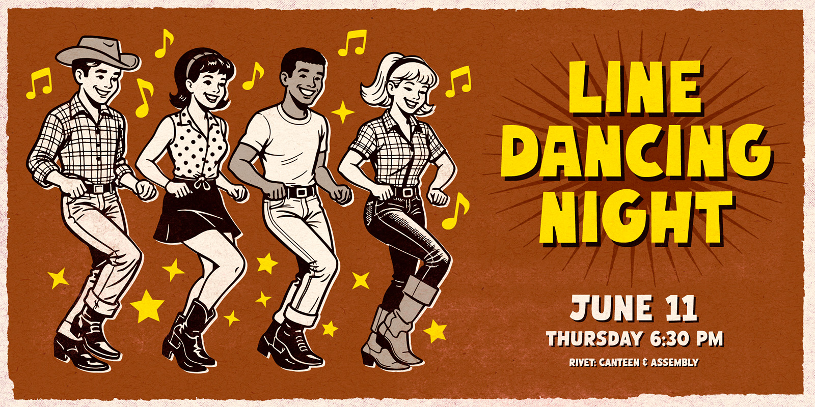 Line Dancing Night is back at Rivet on Thursday, June 11th! After several nights full of high energy and fun, we couldn’t resist bringing it back for another round. All skill levels are welcome to attend, whether you’re just learning the steps or already a line dancing pro!